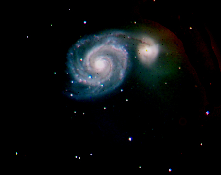 M51 Spiral Galaxy “The Whirlpool” in Canes Venatici. 60 min. L, 30 min. R, 30 min. G, 60 min. B, C-11 @ f/6.3. Taken 30 June & 1 July 2010, from under the Columbus nebula. Posted 24 July 2010 The holy grail of astrophotography | Same raw frames reprocessed, smaller field of view (“FOV”) than the original.