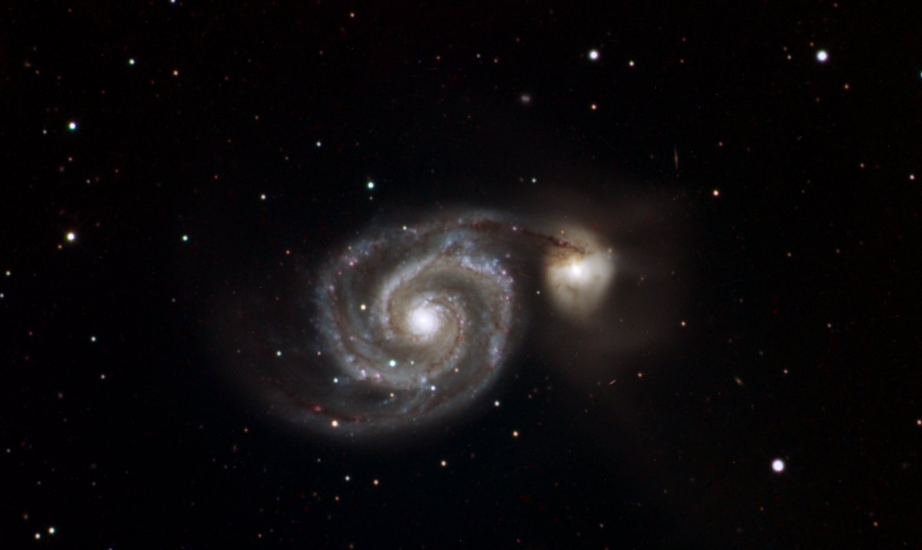 The Whirlpool Galaxy image was acquired with an SBIG ST-8XME camera with AO-8, SBIG CFW-10 with Custom Scientific LRGB filters (for tricolor images), and an Astro-Tech f/8 AT8RCF on a Losmandy Gemini I G-11 GEM. |