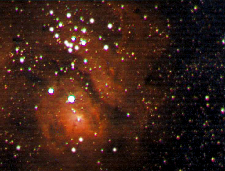 Emission Nebula (M8/NGC6523) "The Lagoon" in Sagittarius. 3600 secs. with the SAGA and Starlight Xpress MX7C camera. |